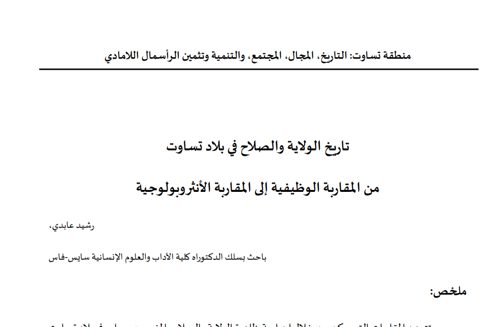 الموضوع الثالث: رشيد عابدي: تاريخ الولاية والصلاح في بلاد تساوت من المقاربة الوظيفية إلى المقاربة الأنثروبولوجية