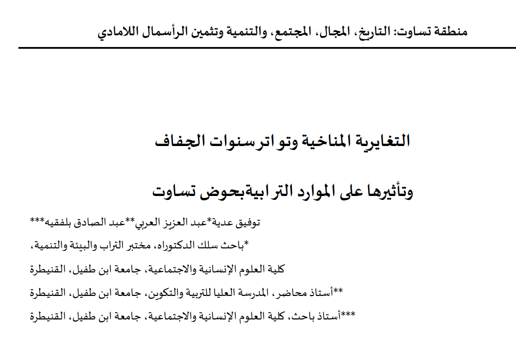 الموضوع الرابع: توفيق عدية، عبد العزيز العربي، عبد الصادق بالفقيه التغايرية المناخية وتواتر سنوات الجفاف وتأثيرها على الموارد الترابية بحوض تساوت