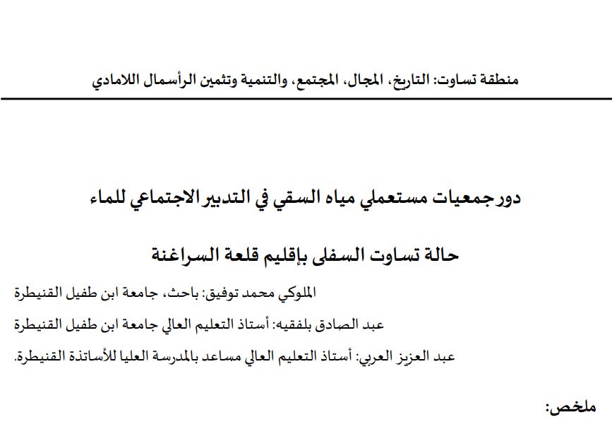الموضوع الخامس: الملوكي محمد توفيق عبد الصادق بلفقيه، عبد العزيز العربي دور جمعيات مستعملي مياه السقي في التدبير الاجتماعي للماء حالة تساوت السفلى بإقليم قلعة السراغنة